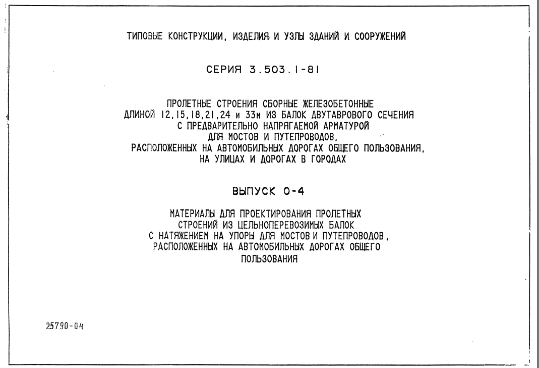 Выпуск 0-4. Пролетные строения из цельноперевозимых балок с натяжением на упоры для мостов и путепроводов, расположенных на автомобильных дорогах общего пользования.